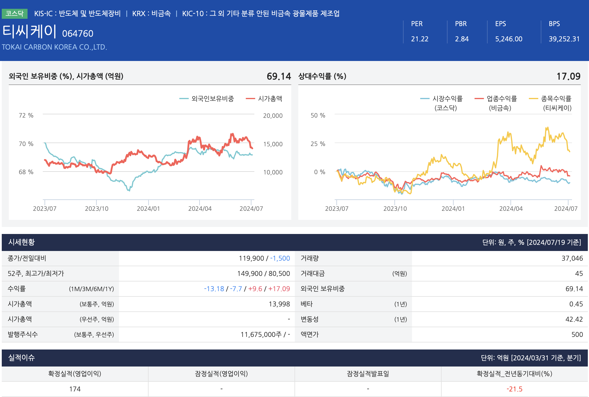 일본의 토카이 카본과 국내 기업 KC(케이씨텍의 모회사)의 합작사로 SiC 포커스링 및 세라믹 부품 소재 기업. 글로 벌 주요 전공정 장비사로 납품하는 비중이 높으며 경쟁사로는 하나머티리얼즈가 있음. SiC 포커스링 시장은 납품처에 따라 비포 마켓(장비사)과 애프터 마켓(제조사)으로 나뉘며 티씨케이는 비포 마켓에 속함. 애프터 마켓 기업으로는 티씨케이, 케이앤제이 등이 있음. 타사에 비해 티씨케이가 가진 경쟁력은 국내 최초 제조, 최초 납품, 그리고 독보적인 시장 점유율에 있음. 또한 일괄 생산 체제를 구축하여 원가 측면에서도 경쟁력을 확보. 고객사는 글로벌 장비사와 일부 직납하는 제조사를 보유. 비상장 경쟁사와의 특허 소송은 결과를 기다리는 중이며, 고객사의 대체품 요구나 로열티 조정 등의 변동은 없는 상황. NAND 업황은 OEM으로 나가는 특성상 제조사의 가동률이나 선단 공정으로의 전환과 다소 시차가 있음. 하지만 올해 4분기는 3분기와 유사한 수준의 실적을 기록할 것으로 보이며 연말마다 이루어지는 단가 조정도 업황의 큰 영향을 받지는 않을 것. 고객사의 V10 제조 장비 테스트 결과는 올해 말 또는 내년에 나올 것으로 예상. 새로운 모멘텀으로 TaC를 코팅한 서셉터(웨이퍼 지지대)와 내플라즈마 소재의 포커스링, 전력 반도체를 위한 SiC 단결정 웨이퍼 등이 있어 전반적인 매출 구조와 이익성 개선의 여지는 충분하다고 판단.