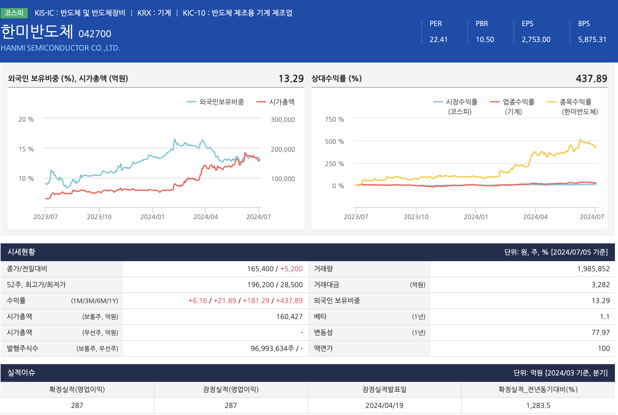 인공지능(AI) 반도체 열풍의 수혜를 톡톡히 입으며 1년반 만에 주가가 약 17배 급등한 종목이다. AI 반도체 수요가 폭증하자 제품 탑재에 필수적인 고대역폭메모리(HBM)가 특수를 누리면서 수혜 기대감에 한미반도체의 주가는 가파른 상승곡선을 그렸다. 7일 한국거래소에 따르면 지난 5일 한미반도체는 전 거래일 대비 5200원(3.25%) 오른 16만5400원에 거래를 마쳤다. 한미반도체는 6월 중순 AI반도체 대장주 엔비디아와 주요 고객사인 SK하이닉스의 주가가 사상 최고치를 경신하자 장중 한때 19만6200원(6월14일)까지 치솟기도 했다. 이는 올해 초와 비교해 3배 넘게 오른 주가 상승률이며 1년6개월 만에 17배(1만1300원) 가량 뛴 것이다. 한미반도체의 주가는 AI 반도체 열풍이 시작된 2023년 초부터 HBM용 'TC본더' 공급 기대감에 급등하기 시작했다. 그해 1월 1만원 초반에서 움직이던 주가는 꾸준히 상승세를 나타내며 1년 만에 5배 가량 뛰었다. TC본더는 열과 압력을 이용해 칩을 적층하고 전기적으로 연결하는 장비로, HBM칩을 생산하기 위한 핵심 장비다. HBM 시장의 선두주자 SK하이닉스는 지난 2022년 업계 최초로 4세대 HBM 양산을 시작해 엔비디아에 독점으로 공급했고, 지난 3월부터 5세대 HBM(HBM3E)도 납품하기 시작했다. 쉽게 말해 HBM 밸류체인은 '한미반도체→SK하이닉스→엔비디아'로 이어지는 셈이다.