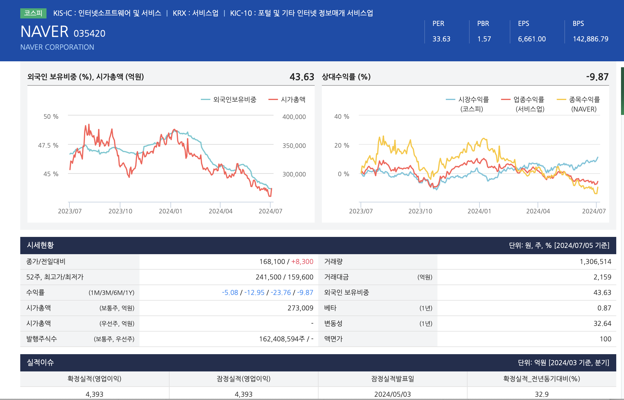 2Q24 매출액 2조 6,168억원(YoY 8.7%, QoQ 3.6%), 영업이익 4,117억원(YoY 10.5%, QoQ -6.2%) 예상. 매출은 컨센서스 부합 전망. 영업이익은 웹툰의 나스닥 상 장에 따른 성과급 등 일회성 비용 발생으로 컨센서스 하회 전망 서치플랫폼. 매출 9,541억원(YoY 4.8%, QoQ 5.4%) 추정. 홈피드, 숏폼, 치지직 등의 광고 성과와 중국 커머스 광고 수혜 예상. 특히 홈피드DA는 2023년 10월 출시 이후 지난 4월 광고주 수 급증. 치지직은 신규 출시로 광고 단가 할인 프로모션 진행 중으로 향후 프로모션 종료 시 광고 실적 기여도 증가 판단. 커머스. 매출 7,136억원(YoY 12.8%, QoQ 1.4%) 추정. 네이버 쇼핑 GMV는 전분기 성장률과 유사한 약 YoY 5% 성장 추정. 브랜드스토어의 거래액 성장은 미미하나, 2023년 10월부터 부과한 수수료 에 대한 판매자들의 동의율 증가 중인 것으로 파악. 이에 따라 전체 커머스 take rate 이 소폭 증가하는 효과 예상. 참고로 브랜드스토어 거래액은 네이버쇼핑 전체 거래액 대비 약 10% 초반으로 추정 6/26 웹툰의 나스닥 상장. 공모가는 21달러로 보고서 발간일 기준 현재 시총은 한화 약 4조원 수준. 그동안 네이버 기업가치 산정에 반영한 웹툰 사업가치(5조원)보다는 낮은 수준으로 12MF PSR 2.3배 수준. 글로벌 peer의 PSR(3x)과 비교 시 부담스러운 밸류에이션은 아니지만, 향후 웹툰 상장이 네이버의 주가 상승으로 이어지기 위해서 는 웹툰 산업의 지속적인 성장 확인 필요. 단기적으로는 자회사의 상장 이벤트보다는 본업의 견조한 이익 성장이 긍정적인 주가 흐름으로 이어질 것으로 판단. 하반기 네이버의 영업이익은 상반기대비 약 10% 증가 추정, 하반기 주가 상승 전망.