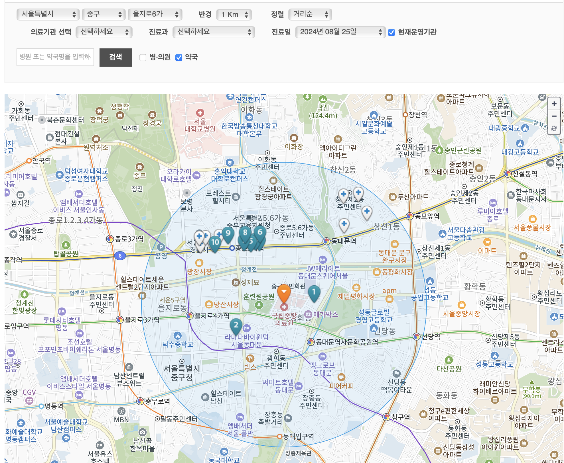 검색할때 지도로 보기를 선택하면 지도 위에 약국위치를 보여줍니다.