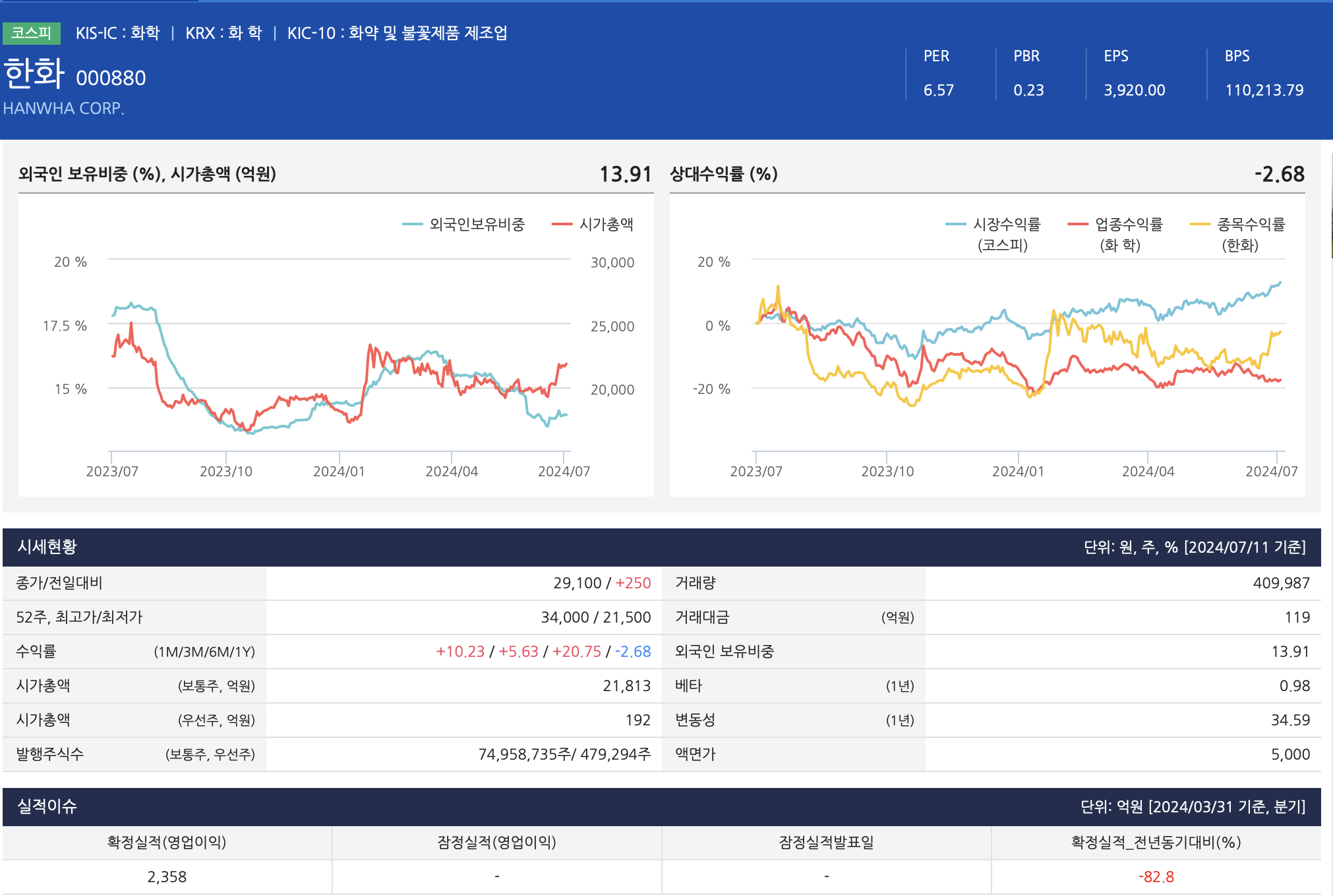 - 종속기업 한화솔루션의 부진으로 태양광 및 화학부문의 매출이 감소하였으나 건설부문의 수주 프로젝트 공정 호조, 방산부문의 수출 증가, 금융업의 투자수익 증가로 전년대비 매출 소폭 증가.
