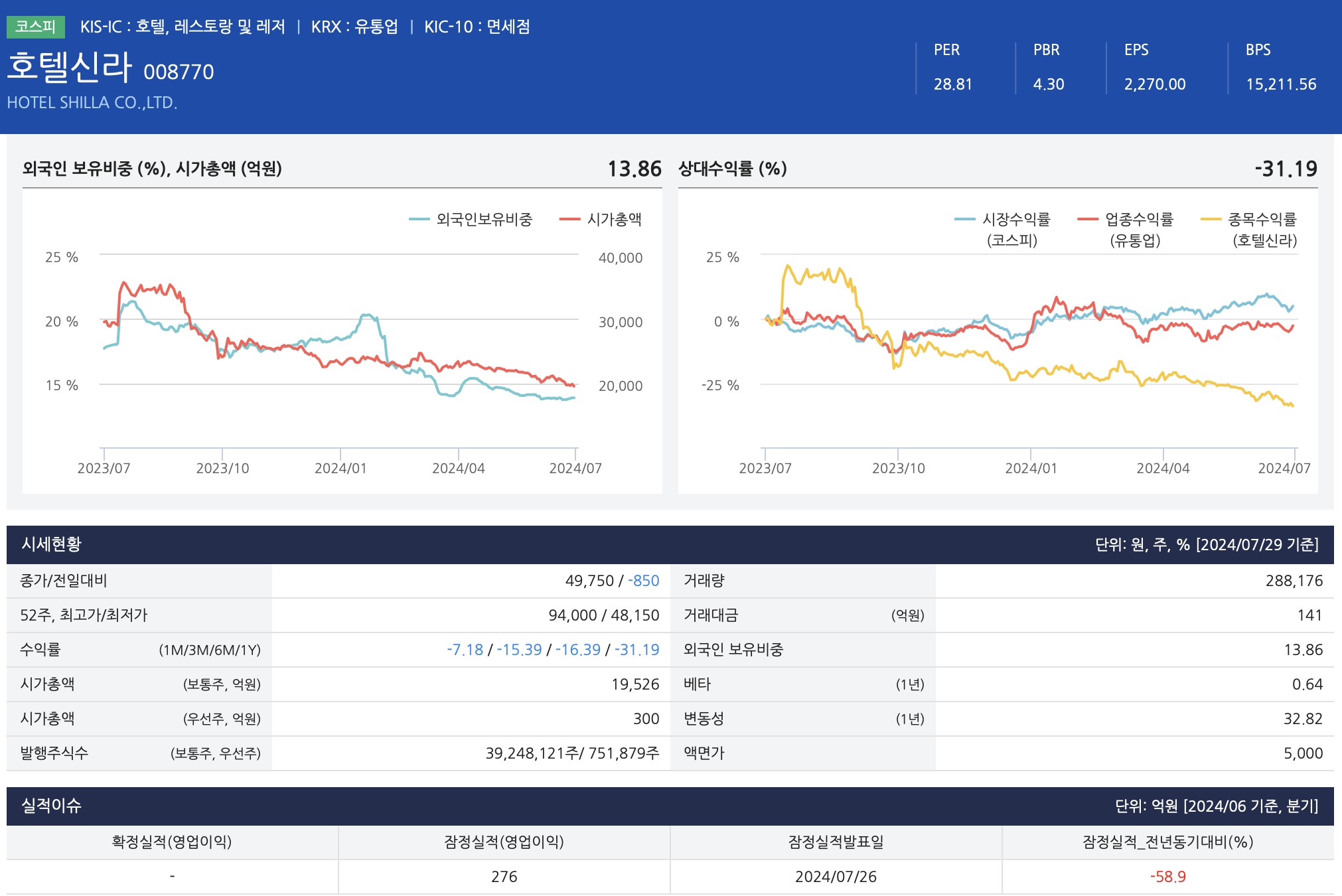 호텔신라는 2Q24 매출액 10,027억 원(+15.7% YoY), 영업이익 276억 원(-58.9% YoY)을 기록해 영업이익 기준 시장 기대치인 329억 원을 소폭 하회하는 실적을 기록했다. 호텔/레저 부문이 감익을 기록한 것이 시장 기대치 하회의 주요 원인이었다. 호텔/레저부문은 견조한 수요로 인하여 전년대비 +6.9% YoY 성장했으나, 지난해 인건비 회입 관련 일회성 비용 30억 원의 기저 및 고정비 증가 등의 영향으로 영업이익이 시장의 기대와는 달리 -14.2% YoY 감소했다. TR부문은 1Q24와 외형 측면에서 큰 변화가 없었기 때문에 유사한 수준의 실적을 유지했다. 면세점 산업의 반등이 쉽지 않다. 결국은 중국의 경기 상황이 개선되고 있지 못한 상황에 따라 따이공의 수요 회복과 GT의 유입이 약한 상황이다. 중국 소비 경기 자체가 약한 것도 있겠으나, 엔저 현상에 따라 중국 내 소비가 일본으로 이탈되고 있는 것도 주요한 원인이라 할 수 있겠다. 이는 최근 실적을 발표한 주요 럭셔리 기업들의 실적에서도 공히 확인할 수 있는 데, 대표적으로 LVMH의 경우, 2 Q24 일본 시장 매출은 엔저에 따른 중국 및 아시아 관광객 수요로 +57% YoY 성장한데 반하여 일본을 제외한 아시아는 -14% YoY로 부진했다. 중국의 현지 수요가 일본으로 이탈하면서 소비 반등은 더디게 나타나고 자연스럽게 따이공의 수요 반등이 지연되고 있다고 판단한다. 더불어 위안화환율 약세가 중국인의 구매력 약화를 이끌고 있다. 매크로 관점에서 국내 면세점이 어려움을 겪는 환경에 있다고 판단되며, 엔화/위안화 등의 반등이 나타난다면, 면세점 업황 개선을 기대해 볼 수 있겠다고 전망한다. 최근 나타나고 있는 엔화/위안화 강세 전환 흐름을 지켜볼 필요가 있겠다.