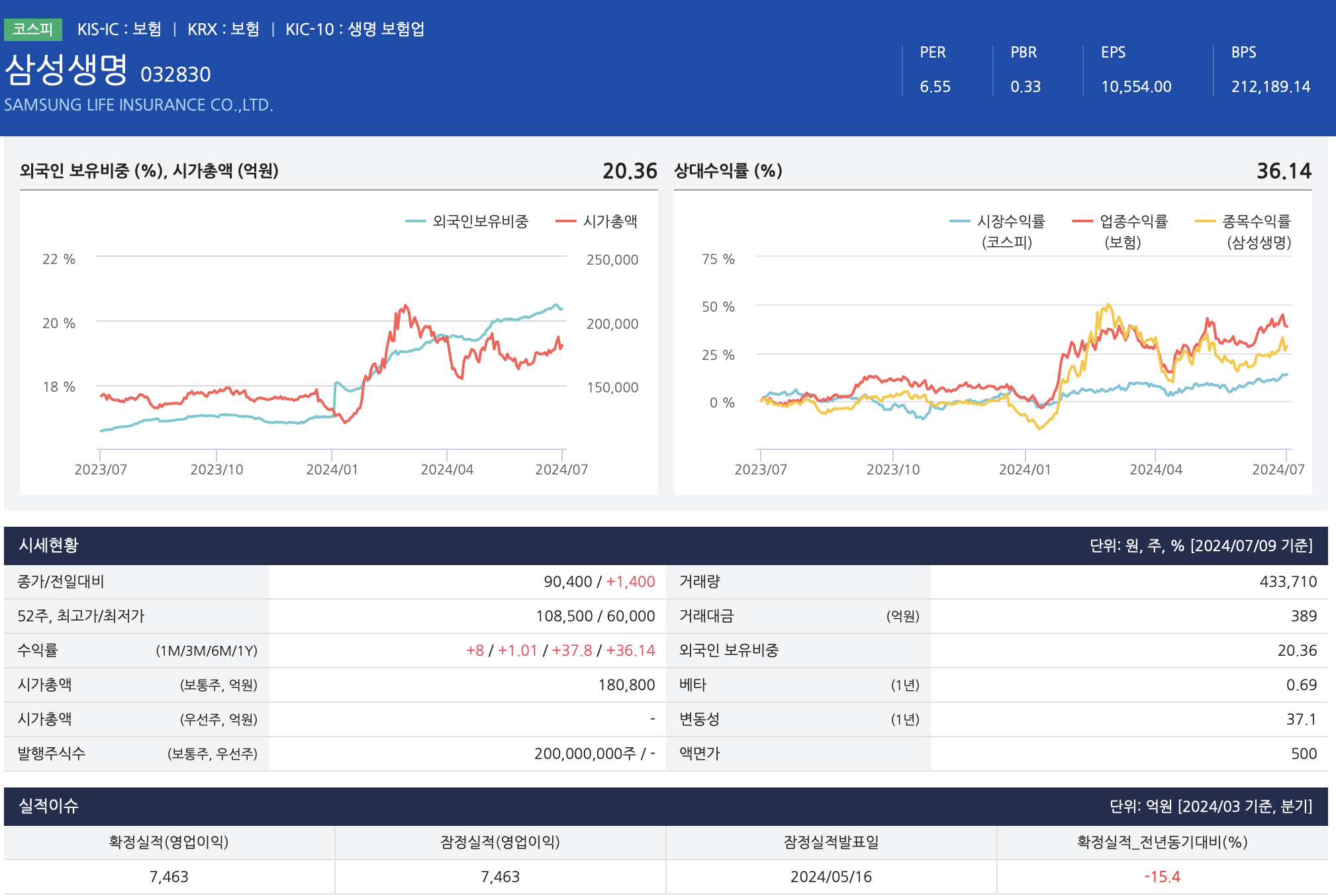 2Q24 지배 순이익 5,914억원(+121% YoY), 서프라이즈 기대 삼성생명의 2Q24 연결 지배 순이익은 5,914억원(+121% YoY)으로 시장 컨센서스를 18% 상회하는 어닝 서프라이즈가 기대된다. 삼성카드의 YoY 증익(컨센서스 참고)과 양호한 시장 환경을 고려해 연결 이익 증 가 효과가 확대될 것으로 추정하였다. vs. 2Q23(YoY): 전년 동기 발생했던 처분손실의 기저효과로 투자손익이 대폭 증가하면서 지배 순이익이 2배 이상으로 증가할 전망이다. vs. 1Q24(QoQ): 전분기 시행세칙 변경에 따른 예실차 -780억원 영향 이 소멸되지만 계절적 배당수익 감소가 이를 상회하므로 영업이익은 1/3 수준 감소할 전망이다. 2Q24 보험손익은 4,073억원(-6% YoY, +52% QoQ)으로, RA 상각률 하락(∵금감원 가이드라인) 직전이었던 전년 동기보다는 감소하고 시행세 칙 변경에 따른 일시적 비용이 있었던 전분기보다는 증가하겠다. 당분 기가 경상 수준이다. 2Q24 투자손익은 일반계정 기준 841억원(흑전 YoY, -83% QoQ)으로 예상한다. 평가/처분익을 530억원 반영하였다. 신계약 APE는 단기납 종신 판매의 축소를 주 원인으로 23% QoQ 감소할 것으로 예상된다. 대신 마진 배수는 일부 회복되므로, 신계약 CSM은 10% QoQ 감소에 그칠 것으로 추정하였다. 삼성생명은 수정 book value를 기준으로 경상 ROE 4.5%에 대해 12m forward PBR 0.35배를 기록하고 있다. 지난 1/22일 이후 주가가 54% 상승하면서 valuation이 제고된 결과다. 현재의 이익 체력에서 배당성 향의 완만한 상승을 가정할 때 2024년 배당수익률은 4.6%로 기대되고, 배당성향 40%를 가정하면 이는 5.1%로 상승한다.