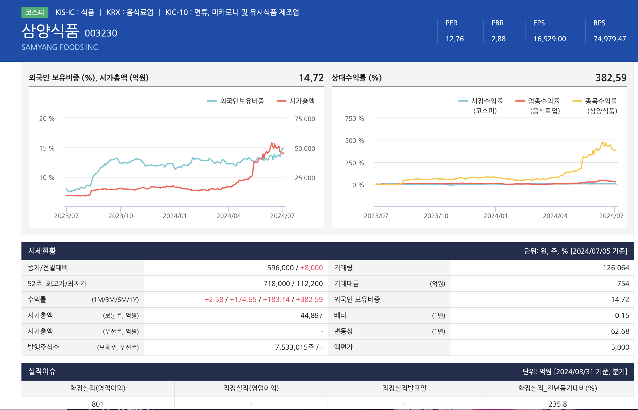 삼양식품의 '24년 1분기 연결 실적은 매출액 3,857억원(+57.1% YoY, +18.1% QoQ), 영업이익 801억 원(+235.8% YoY, +121.5% QoQ, OPM 20.8%), 지배주주순이익 665 억 원(+197.9% YoY, +112.4% QoQ, NPM 17.2%)을 달성하며 역대급 어닝 서프라이즈를 시현했다(시장 컨센서스 424억 원 대비 +89.0% 상회). 불닭볶음면 수출 호조 지속에 고환율 효과가 더해지며 마진이 크게 개선되었고(1 Q24 원/달러 환율 1,329원, +4.1%), 원재료 부담 완화로 매출총이익률은 42.4%를 달성했다(+13.7% p YoY, +3.1% p QoQ). 1 Q24 해외 매출액은 2,890억 원으로 +83.0% YoY, +30.4% QoQ 고성장했으며, 전사 매출액 내 비중도 74.9%로 분기 최대치를 기록했다(+10.6% p YoY, +7.1% p QoQ). [별도법인] 매출 3,008억 원(+83.0% YoY, -4.5% QoQ), 영업이익 684억 원(+252.5% YoY, +29.3% QoQ, OPM 22.7%)을 달성하며 이익률 개선을 견인했다. 내수 매출액은 786억 원(-5.4% YoY, -5.5% QoQ)으로 전년 대비 감소했으나, 별도 내 74%의 비중을 차지하는 수출 매출액이 2,222억 원(+59.2% YoY, -4.1% QoQ)으로 크게 증가했다. [중국법인] 매출액 934억 원(+186.2% YoY, +35.7% QoQ), 영업이익 13억 원(-13.1% YoY, OPM 1.4%)을 기록했다. 1Q 춘절 행사 호조와 4 Q23 이연 물량 반영으로 탑라인 고성장을 시현했다. 2Q24E에는 6.18 행사 흥행 여부가 실적에 중요하게 작용하겠다. [미국법인] 매출액 750억 원(+222.5% YoY, +23.4% QoQ), 영업이익 10억 원(-61.6% YoY, OPM 1.3%)을 기록했다. 래퍼 카디비, 까르보불닭 소녀 등 자발적인 틱톡 바이럴에 힘입어 까르보불닭 인기가 급증하며 물량이 크게 늘었고, 에스닉∙메인스트림 채널 입점 확대를 통해 대응하고 있다. 까르보불닭 제품의 매출 비중은 '21년 14% -> '22년 16% ->'23년 24% ->1Q24 33% 수준까지 지속 증가하고 있는 것으로 추산된다.