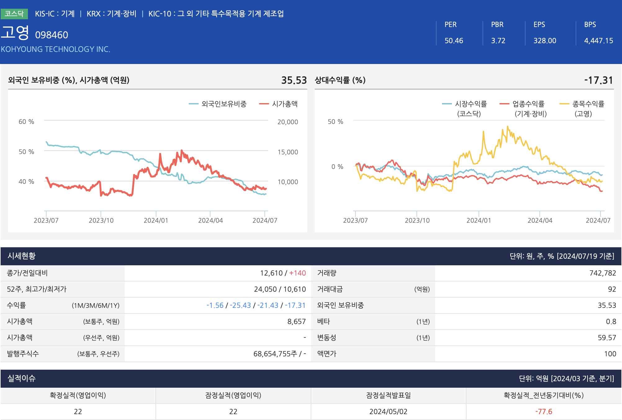 - 전방 반도체 및 IT 산업의 위축에 따른 3D SPI, 3D AOI 등의 검사장비 공급 감소와 미국 법인의 부진 등으로 매출 규모는 전년대비 축소. - 매출 부진에 따른 판관비 부담 가중으로 영업이익률 전년대비 하락하였으며, 이자수익 증가 및 외화환산손실 감소 등에도 순이익률 하락.