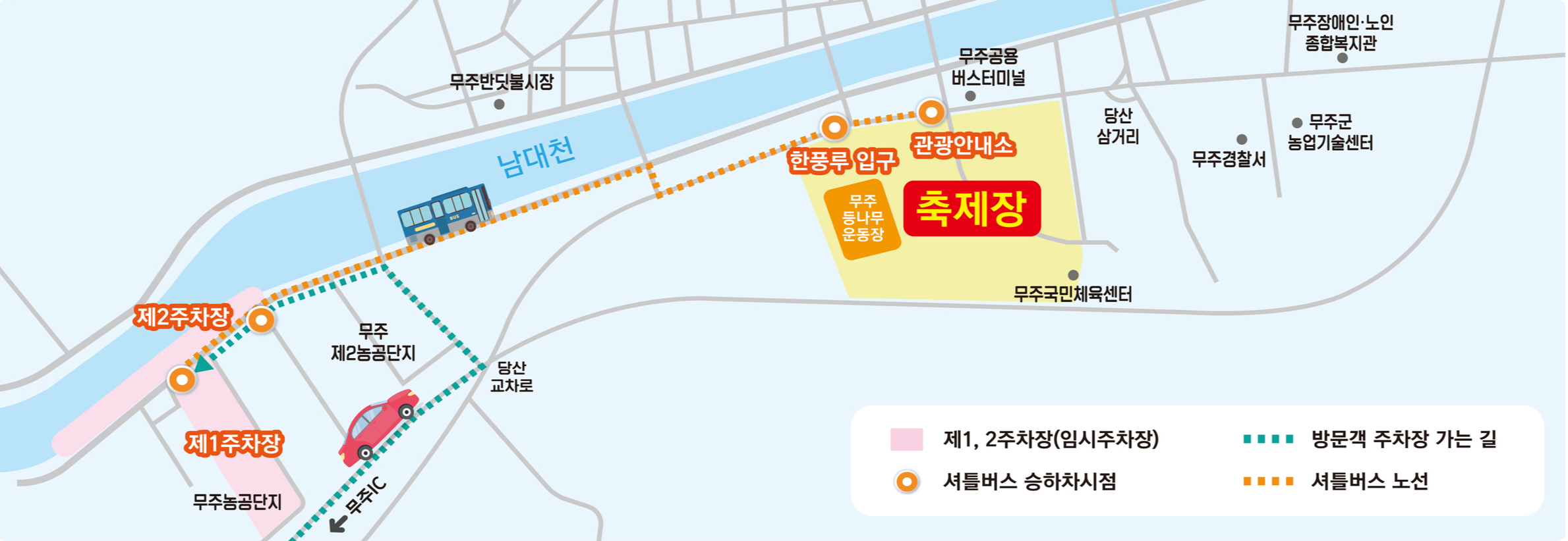- 시내 주차장은 협소하오니 제1, 2주차장(임시주차장)에 주차하시고 셔틀버스를 이용하시기 바랍니다.